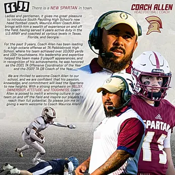 Now finishing his third year as Head Coach at South Paulding High School (6A), Coach Allen has transformed the Spartan football program through clear expectations, player development, and culture-driven leadership.